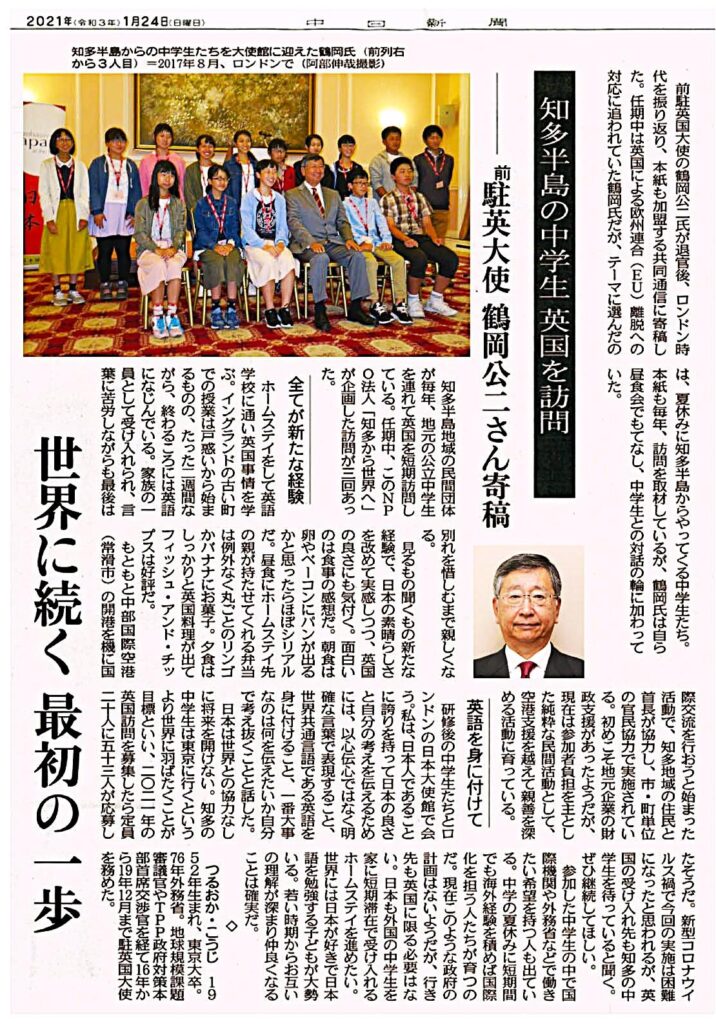 鶴岡大使は、英国駐在中の思い出として、共同通信に寄稿されたものを、中日新聞が取り上げ、2021年1月24日付けの知多版に掲載されました。これを読んだ関係各位 からたくさんのお礼のメッセージをいただきました。